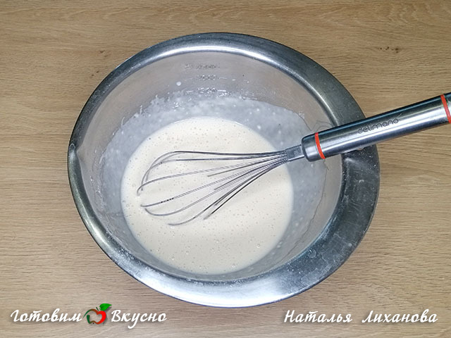 Для приготовления хачапури или сырных лепешек в миске смешиваем молоко, яйцо, соль, сахар, муку и разрыхлитель. Все перемешиваем венчиком до однородной массы.