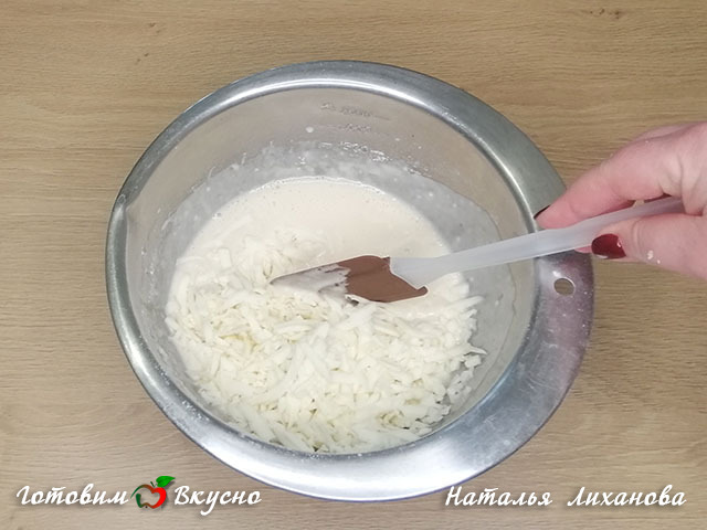 Затем добавляем натертый на терке сыр. Перемешиваем.