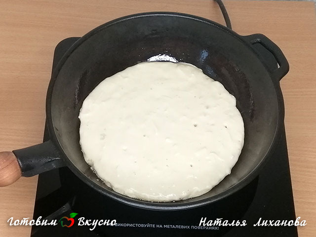 Разогреваем сковороду, смазываем ее растительным маслом и выкладываем ½ часть получившегося теста, жар небольшой. Накрываем крышкой и жарим минут пять с одной и другой стороны, поглядывайте чтобы не пригорели.