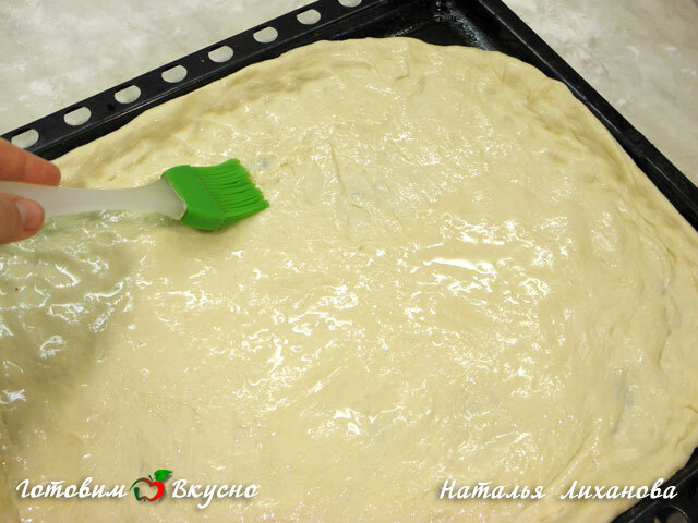 Пицца получится вкуснее, если форму смазать оливковым маслом и присыпать мукой. Перед тем как выкладывать начинку нужно сбрызнуть основу оливковым маслом, это сохранит