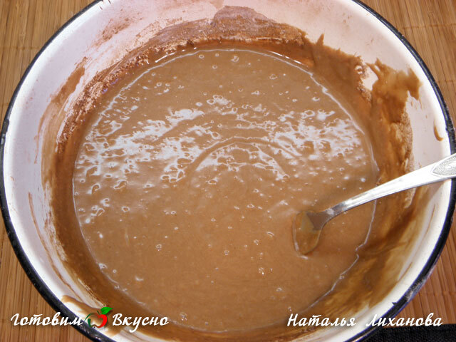 Чтобы приготовить торт с какао и яблоками, растопленное сливочное масло, ванильный сахар, яйца, сахар, соль соединяем и перемешиваем. Добавляем разрыхлитель, какао, молоко, муку и замешиваем тесто.