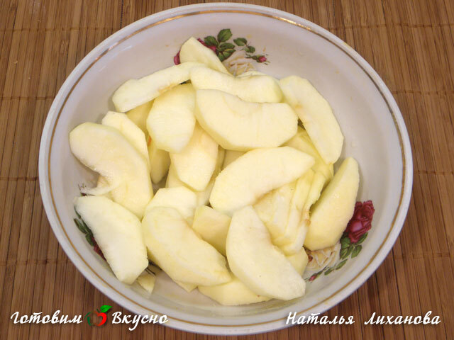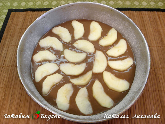 Выливаем половину теста в смазанную маслом и посыпанную мукой форму, раскладываем дольки яблок ( немного оставляем для украшения), заливаем оставшимся тестом.