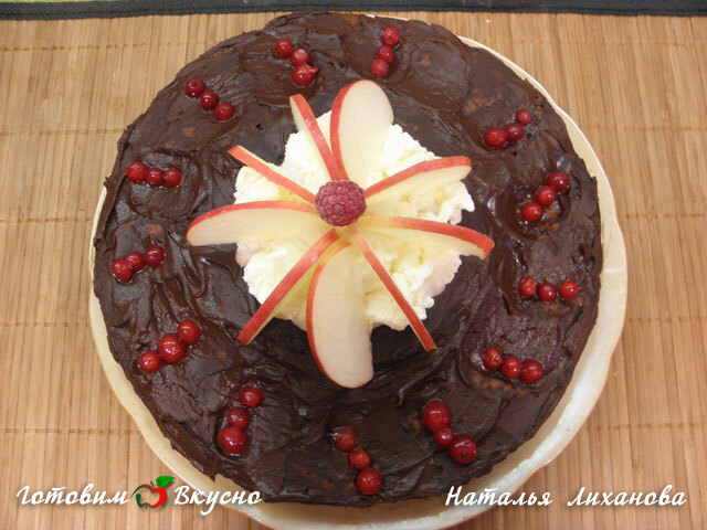 Складываем коржи один на другой и украшаем растопленным шоколадом, сливками, кусочками яблок и ягодами смородины.