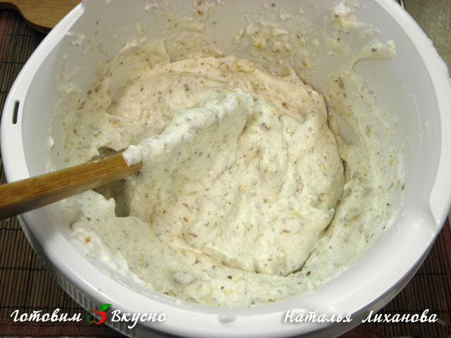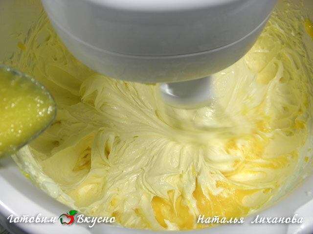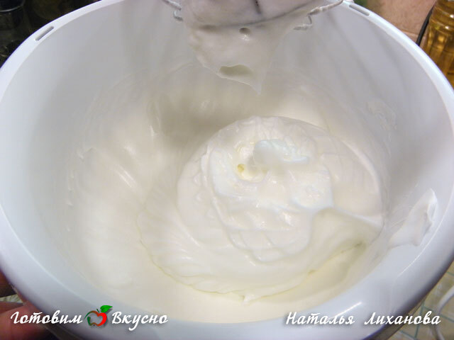 Добавляем полученную смесь в белковую массу и аккуратно перемешиваем в одном направлении снизу вверх до получения однородной смеси.
