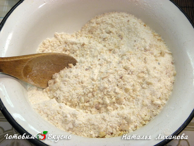 В отдельной миске смешиваем 195 г сахара, 50 г муки и 150 г поджаренных и слегка измельченных орехов. Слишком сильно измельчать орехи не нужно, должны быть кусочки и крупные и помельче. Можно воспользоваться блендером, а лучше поместить орехи в кулек и разбить их скалкой.
