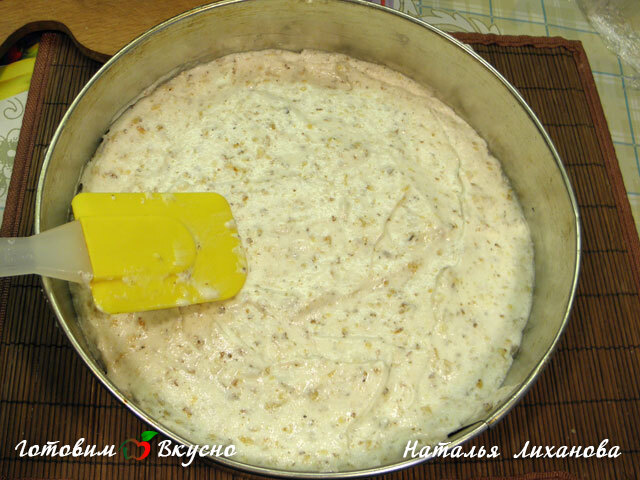 Форму берем разъемную диаметром 28 см., дно застилаем бумагой для выпечки и смазываем маслом. Выкладываем в нее белковое тесто и слегка разравниваем его. Точно также готовим тесто для 2-го коржа. Если формы у вас две, то можно готовить два коржа одновременно. А если одна, то тесто для второго коржа нужно делать непосредственно перед выпечкой.