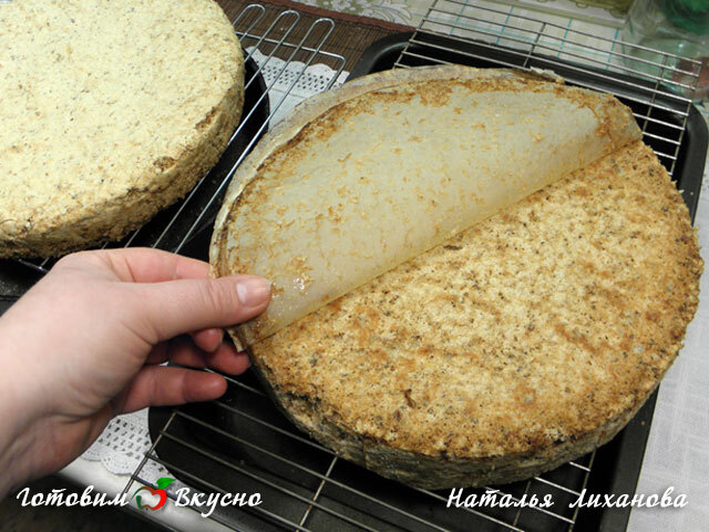 Выпекаем коржи в заранее разогретой духовке 2-2,5 часа при температуре 150 градусов. Готовые коржи выкладываем на решетку, снимаем бумагу и сушим их еще 12-24 часа.