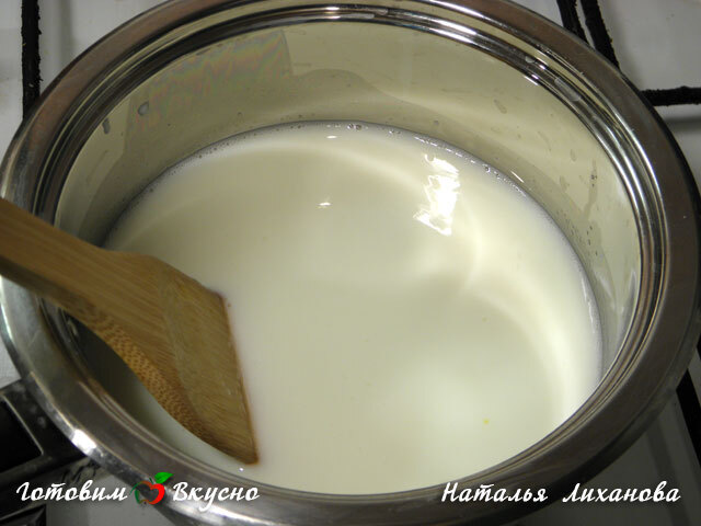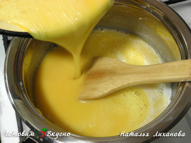 В отдельной посуде взбиваем венчиком 12 желтков (просто взбалтываем) и понемногу (чтобы желтки не свернулись), добавляем половину горячего молочного сиропа. Смесь выливаем обратно в кастрюлю и варим, все время помешивая, до загустения (смесь должна напоминать негустую сгущенку или кисель). Оставляем смесь для охлаждения, в охлажденном виде она станет немного гуще.