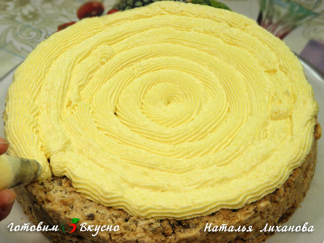 Собираем торт. В торте «Киевский» два вида крема белый и шоколадный, белый внутри и сверху шоколадный. На блюдо выкладываем первый корж и покрываем его толстым слоем крема шарлотт. Удобно это делать при помощи кондитерского мешка и большой насадки.