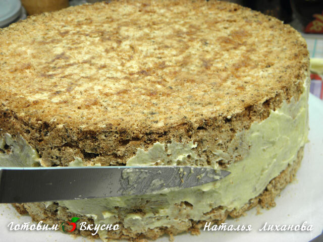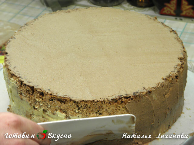 Накрываем вторым коржом, кладем его гладкой стороной вверх. Слегка прижимаем, остатки крема размазываем аккуратно ножом или лопаткой.