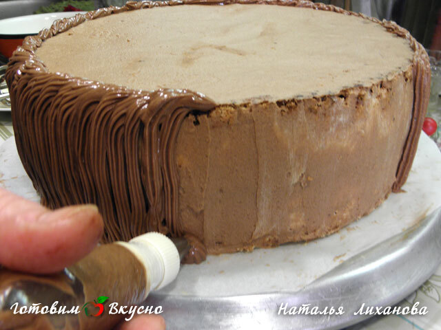Бока торта можно обсыпать ореховой крошкой, крошкой от коржей или украсить кремом. Я украшала кремом, добавив в него еще немного какао, чтобы крем стал немного темнее по цвету.