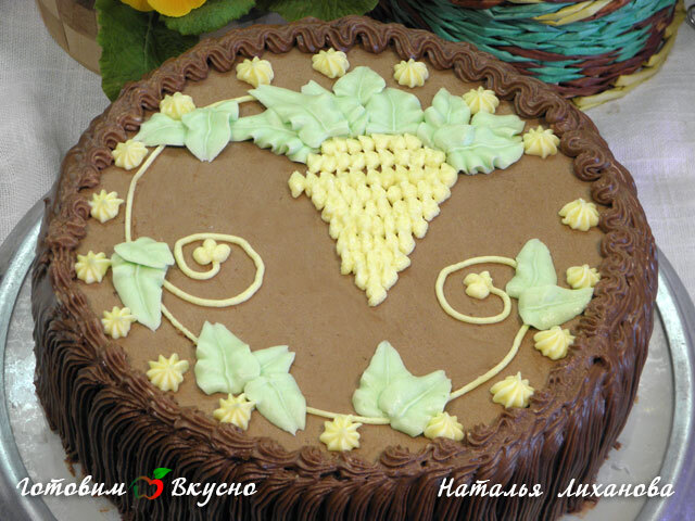 Небольшую часть белого крема оставляем для украшения, а в оставшийся крем добавляем 20 г просеянного какао и хорошо перемешиваем до получения однородного шоколадного крема. Обмазываем бока и верх торта шоколадным кремом.