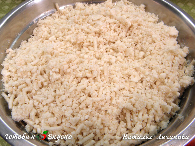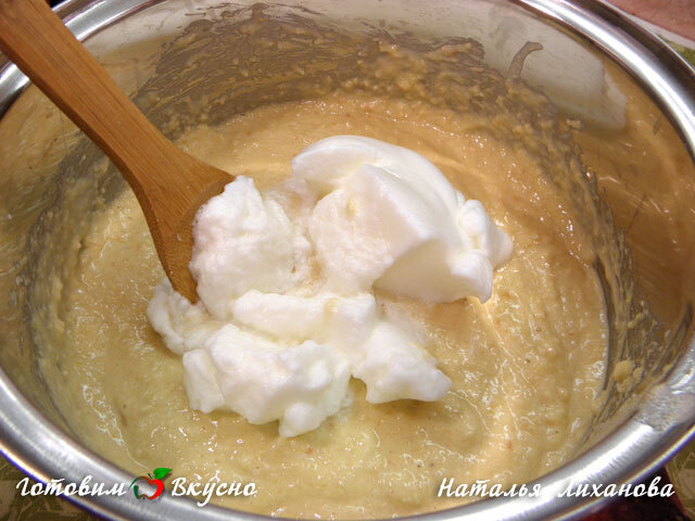 Далее необходимо подготовить форму: смазываем ее маслом и подстилаем на дно бумагу для выпечки. Достаем белки взбиваем их в крепкую пену и осторожно перемешиваем с фасолевым тестом, высыпаем понемногу сухари.