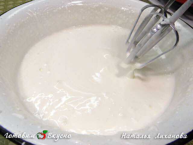Делаем крем. Взбиваем сметану с сахаром при помощи миксера (сметана должна быть комнатной температуры). Добавляем сюда измельченные в блендере бананы.