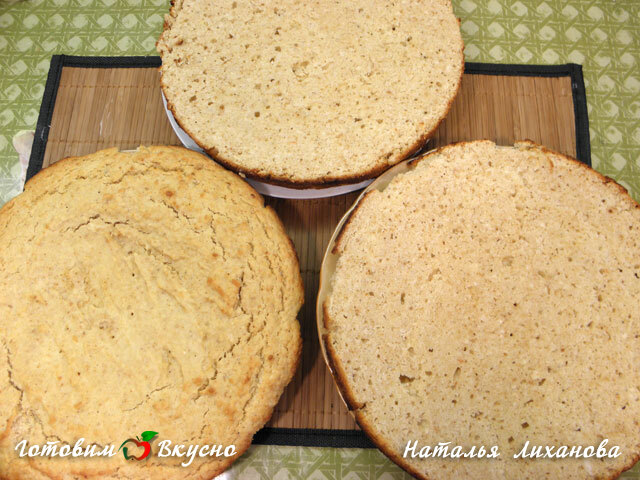 Достаем готовый корж, снимаем бумагу со дна и отставляем его пока не остынет.
