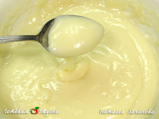 Добавляем молоко, тщательно перемешиваем и ставим на небольшой огонь. Варим массу, непрерывно помешивая до загустения. Далее получившуюся массу необходимо полностью остудить.