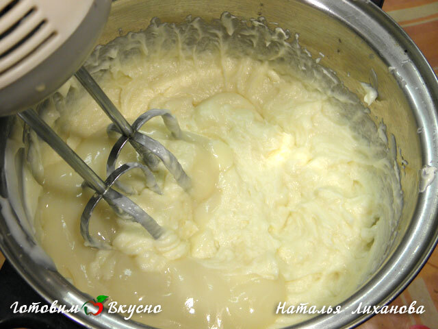 Взбиваем масло при помощи миксера, постепенно добавляя остывшую заварную массу.