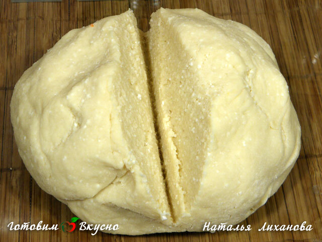 Готовим тесто для творожного торта на сковороде. Творог перетираем через сито или просто вилкой (тогда тесто будет более однородным). Добавляем сахар, яйцо, ванилин, соду, перетираем и постепенно вводим муку. Тесто должно быть плотное, но не крутое. Делим его на 6 частей.