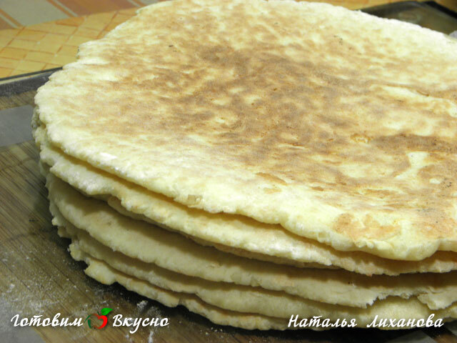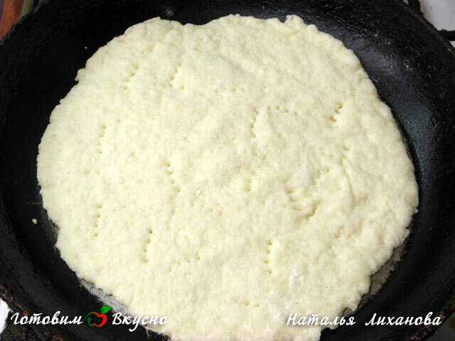 Теперь каждую часть мы раскатываем, вырезаем тарелкой по размеру сковороды (или просто на глазок) с помощью скалки переносим его на сковороду, накалываем вилкой и выпекаем до зарумянивания с двух сторон.