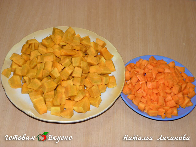 Чтобы приготовить тыквенную запеканку, морковь и тыкву нарезаем кубиками.