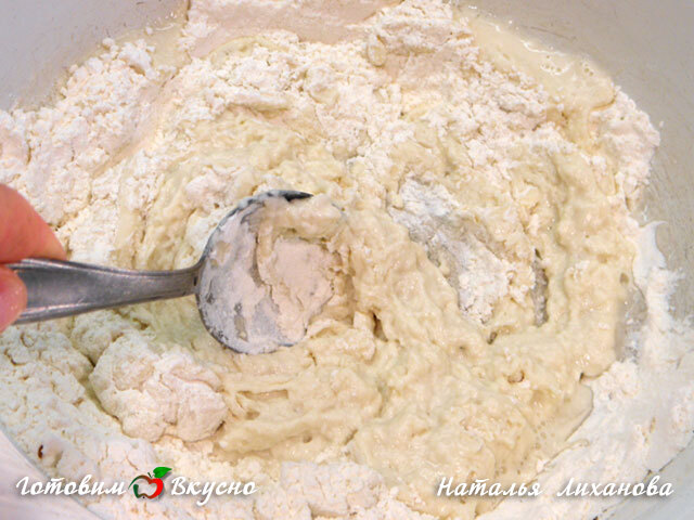Добавляем в тесто оставшуюся воду и немного взбиваем его при помощи миксера или венчика.