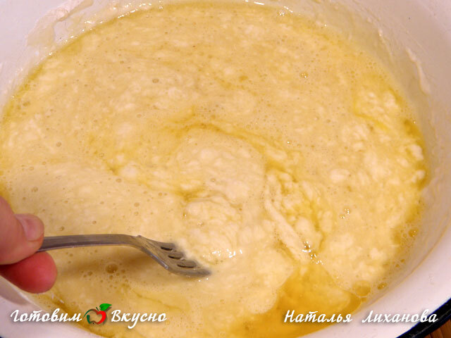 Затем добавляем немного взбитые яйца с сахаром, соль и подсолнечное масло. Снова все перемешиваем.