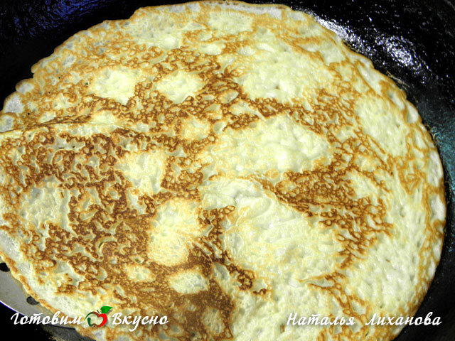 Перед выпеканием первого блина сковороду смазываем подсолнечным маслом, в следующие разы смазывать сковороду не нужно.