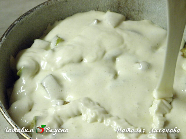 Выпекаем в духовке при 200 градусах 30 – 40 минут. Готовность проверяем зубочисткой (аккуратно протыкаем пирог зубочисткой до самого дна - вынимаем ее, если зубочистка сухая - пирог готов). Перед подачей