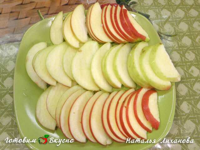 Для приготовления яблочного пирога с изюмом из яблок удаляем сердцевину и нарезаем тонкими ломтиками.