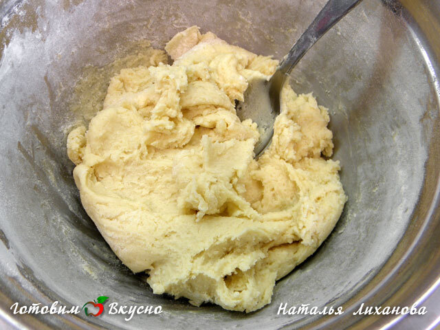 Размягченное сливочное масло растираем с сахаром и щепоткой соли. Добавляем яйцо и смешанную с разрыхлителем муку.