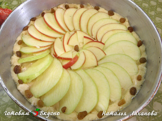 Тесто выкладываем в смазанную растительным маслом форму. Сверху по кругу кладем дольки яблок. Украшаем изюмом и выпекаем 30-35 минут в духовке при 180-200 градусах. Яблочный пирог с изюмом готов!
