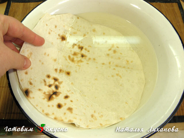 Лаваши, не отделяя друг от друга, окунаем в подсоленную воду и выкладываем на разогретую сковороду со сливочным маслом.