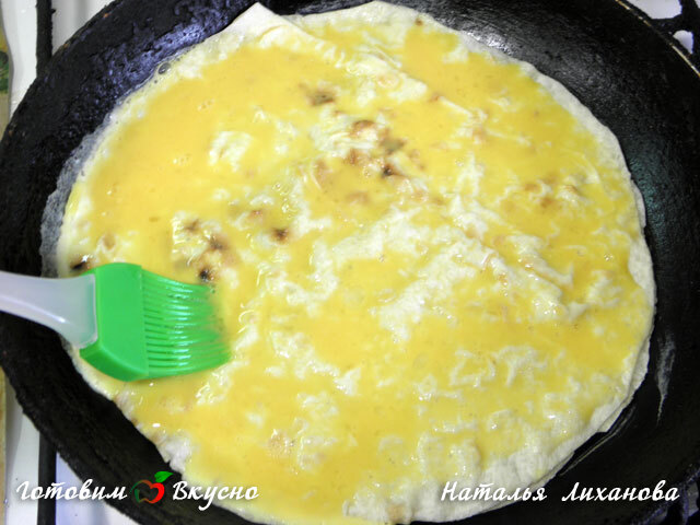 В центр лаваша разбиваем яйцо и размазываем его по всей поверхности. Прожариваем немного.