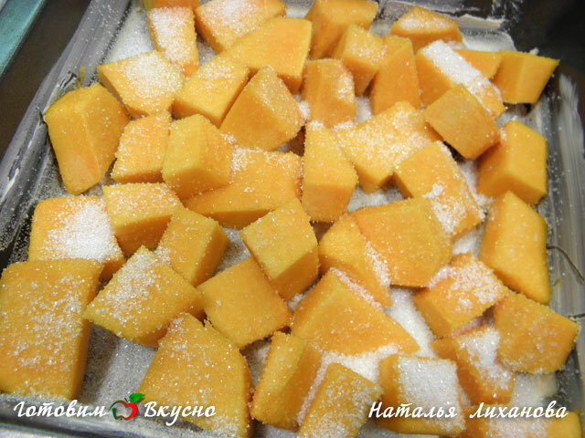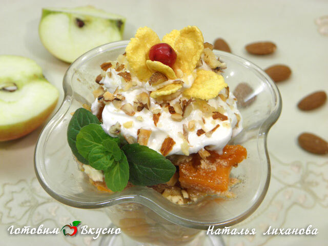 Запеченную тыкву с яблоками подаем в креманках, сверху кладем немного сметаны и присыпаем дроблеными орехами. Дополнительно десерт я украсила кукурузными хлопьями, маленькой вишенкой и веточкой мяты.