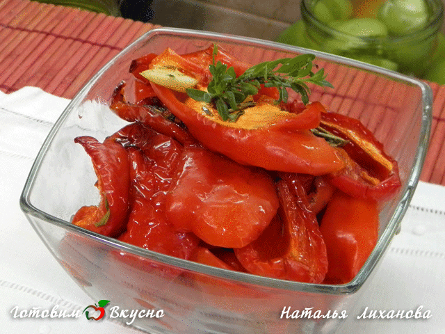 Этот необыкновенно вкусный перец готовится очень и очень просто! Рецепт легкий, а в итоге - шикарная закуска, особенно к мясу. Лучше использовать красный мясистый сорт перца, он обладает особым вкусом и ароматом. Такой перец можно подавать как в горячем, так и в холодном виде. Можно добавлять его в овощные салаты, использовать в бутербродах. А еще перец можно законсервировать на зиму, для этих целей хорошо подходят небольшие баночки с закручивающимися крышками. Из 1 кг перца выходит одна 340 г баночка.