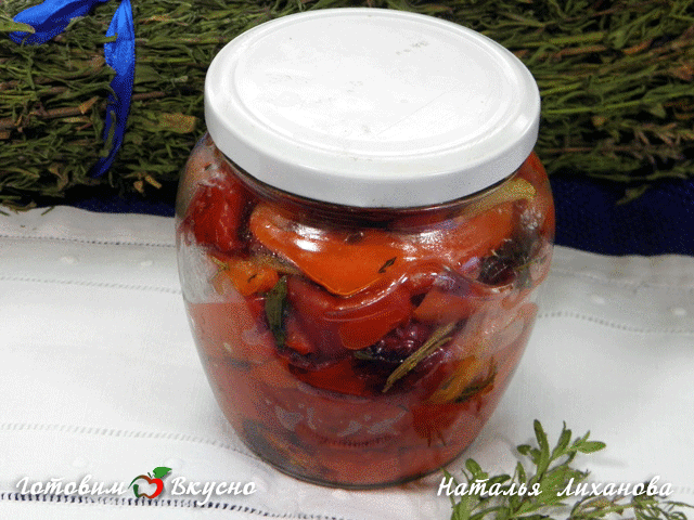 Если такой перец хотите законсервировать на зиму, тогда запеченный перец в горячем виде раскладываем в чистые стерилизованные банки, заливаем маслом с противня и закручиваем крышкой.