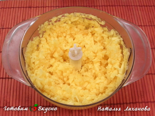 Для приготовления запеканки с яблоками и тыквой измельчаем при помощи блендера (или просто ножом) тыкву.