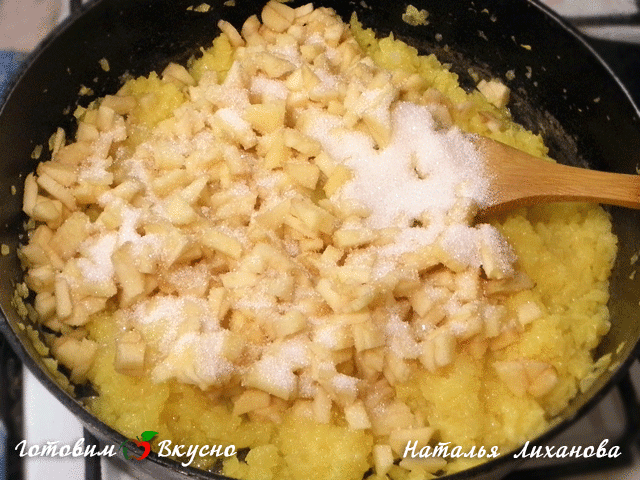 Затем добавляем яблоки, сахар и тушим еще 5 мин.