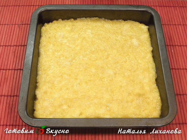 Хорошо взбиваем яйца и перемешиваем с немного остывшей тыквенной смесью. Выкладываем смесь в смазанную маслом форму.