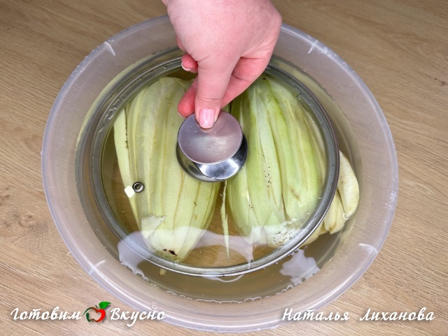 В большую широкую емкость наливаем воду и засыпаем соль, перемешиваем. Кладем сюда баклажаны, придавливаем их крышкой или каким нибудь легким грузом, чтобы они полностью погрузились в воду. Оставляем их на 20-30 минут.