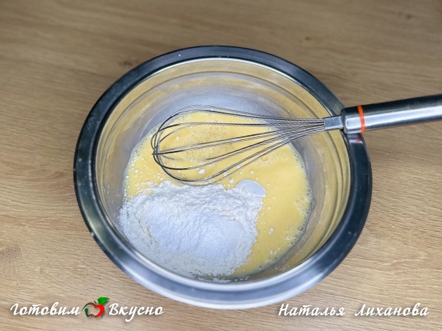 Приготовим кляр. Яйца смешиваем с молоком и солью, затем добавляем муку и разрыхлитель. Перемешиваем.