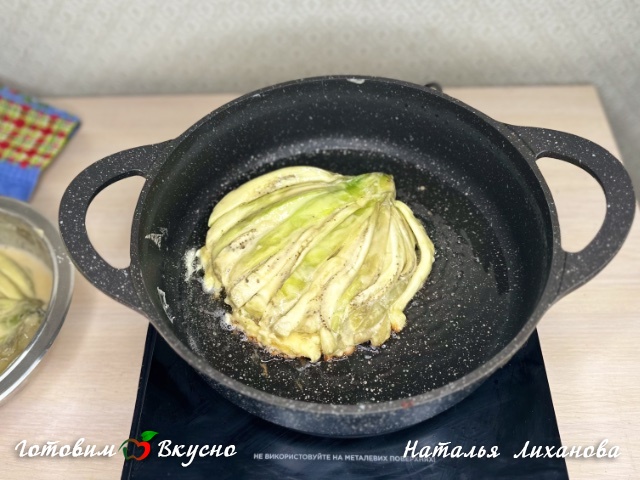 Окунаем каждый баклажан в кляр с двух сторон, чтобы баклажан полностью покрылся смесью.
