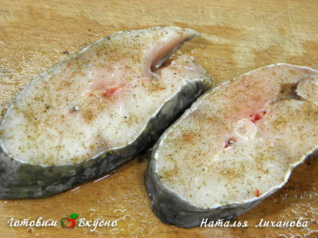Для приготовления жареного сома в ореховой панировке рыбу моем, нарезаем, солим и перчим. Оставляем на 15-20 мин.
