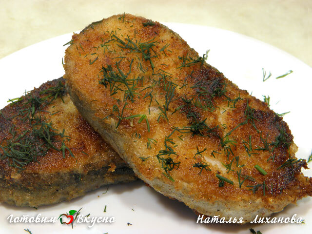 Теперь обжариваем рыбу на сковороде с растительным маслом с двух сторон до золотисто-коричневой корочки. Подаем жареного сома в ореховой панировке с салатом или картофелем.