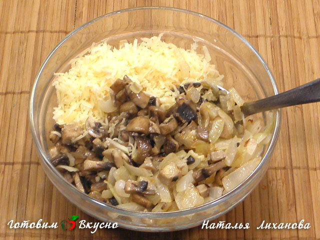 Соединяем лук с грибами и добавляем к ним натертый на средней терке сыр. Все хорошо перемешиваем – начинка готова!
